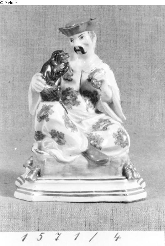 Schnorr von Carolsfeld: Pagode auf vierseitigem purpurnem Kissen mit goldenen Quasten sitzend. Das linke Bein untergeschlagen, das rechte aufgestellt und leicht nach außen geneigt. Die rechte Hand am Rücken eines Affen, der mit erhobener Vorderpfote auf dem rechten Oberschenkel des Chinesen sitzt und schreiend nach einem Apfel in der linken Hand seines Herrn verlangt. Das Gewand weiß mit einem Muster großer eisenroter, von grünen Blättchen umgebener Blumen. Aufschläge, Gürtel und Kragen zitronengelb. Schuhe und Hut eisenrot, der hängende Schnurrbart und die Pupillen schwarz, das strähnige Haar graubraun. Der vierseitig geschweifte weiße Sockel profiliert, an den Ecken abgeschrägt und mit drei goldenen Streifen abgesetzt. Mund und Ohren für den Rauchabzug durchbohrt, ebenso das Maul des Affen. Um 1730. Schwertermarke im hohlen Sockel. Höhe 17 . - Das Modell wohl von der gleichen Hand wie Nr. 28. Nach Zimmermann, das Meißner Porzellan 1925, Tafel 12, kommt als Modelleur der Former Georg Fritzsche in Betracht. Das Gegenstück eine sitzende Chinesin mit Papagei.