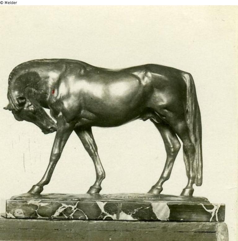 Das Pferd steht ruhig und reibt die Schnauze an dem weit vorgestellten l. Vorderfuss. Bez. K. Schüppel