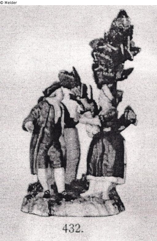 Volkstedt; Gruppe vor einem Baum. Beschreibung Lepke: "Kleine Gruppe, stehender Mann mit Glas und Frau mit einem Krug in der Hand, unter einem grünbelaubten Baume. Der Mann, an ein gelbes, aufrechtstehendes Faß gelehnt, bekleidet mit einem schwarzem Hut,