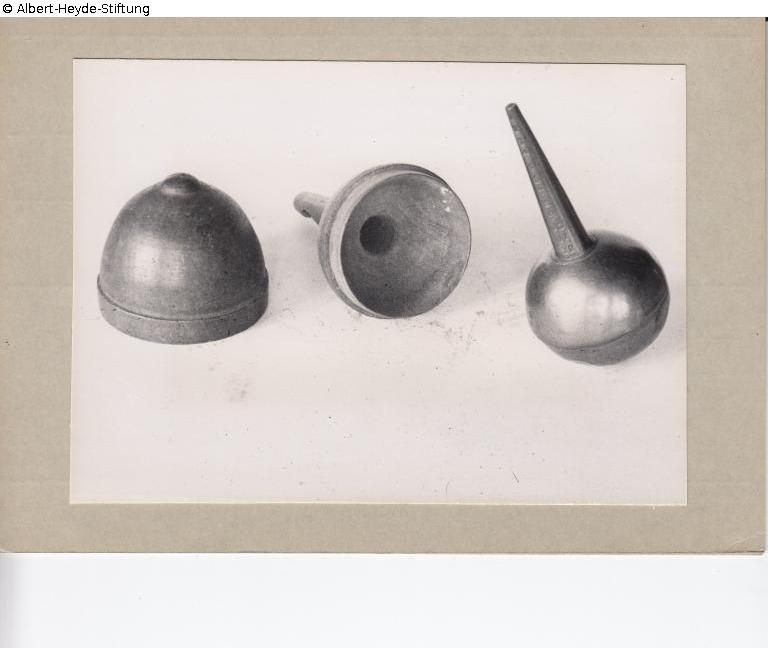Hölzerne Kugel, halb in metallischer Fassung mit spornartiger Skala in zweiteiliger Holzkapsel. Instrument zur Prüfung der Bierqualität.