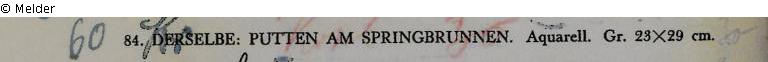 Eduard Fuchs bis 1933; 26.10.1933 Beschlagnahmung durch das Finanzamt Berlin-Zehlendorf; am 15.12.1933 Übergabe an die Gestapo laut Überlassungsprokoll: Paket 5: „1 Bild darstellend 2 nackte Personen unter der Fontäne des Springbrunnens, ohne Signum (N°16 A 4)"; 19.09.1935 kurzfristige Freigabe der Sammlung Fuchs durch den Reichsminister für Wissenschaft, Erziehung und Volksbildung; 16. und 17.06.1937 Versteigerung Rudolph Lepke, Katalog 2114, Nr. 84: „Max Slevogt: Putten am Springbrunnen. Aquarell Gr. 23 x 29 cm. Goldrahmen“; ersteigert von dem Lepke-Kommissionär Carl Braunstein (Berlin-Lichtenrade / Straße 6a Nr. 25) für RM 60,- RM (Schätzpreis: RM 30,-), möglicherweise ebenfalls im Auftrag des Kurators der Berliner Nationalgalerie Dr. Hans Voss (?); Verbleib unbekannt