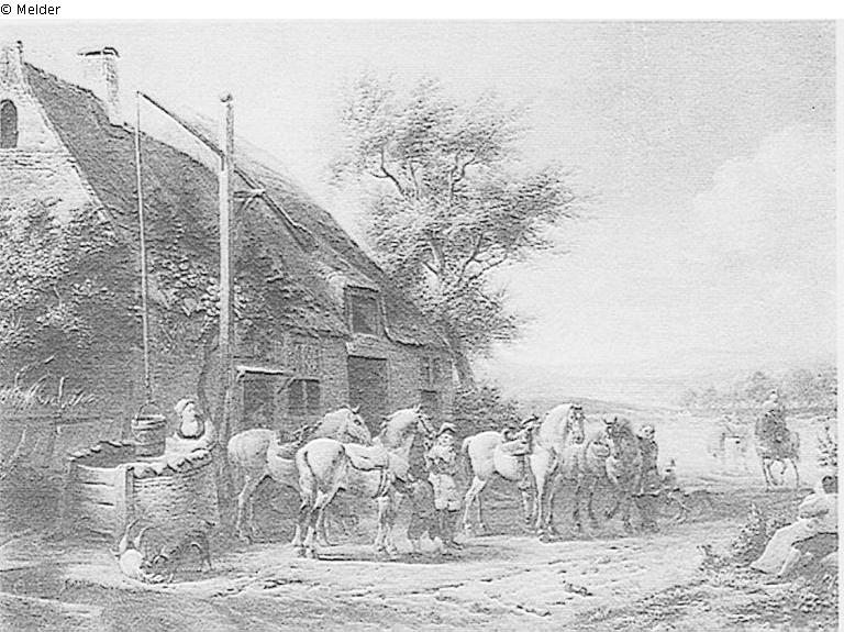 Reitergesellschaft, vor einem ländlichen Wirtshaus rastend