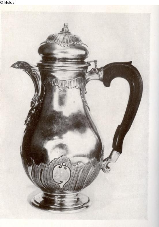 Kanne birnenförmig mit getriebenen fein punzierten Rocaillen am Deckel, an der Schnauze, am oberen und besonders am unteren Rand. Der Henkel aus dunklem Holz, Deckel doppelt, der Knauf in Holz eingeschraubt, der abgesetzte Fuß ist profiliert; Meisterzeichen: Kü SEL; Beschauzeichen Bär mit A, beide unter d. Fußplatte Neuerwerbungen des Märkisches Museum. Kulturgeschichtliche Erwerbungen des Jahres 1930 V, Berlin 1931, S. 12, Abb. 3