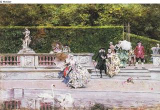 Die Gesellschaft kommt die Terrasse zum Wasser herab. Unten Schwäne; G.-R.; signiert; Scène galante (Probably the Parc de Versailles) (Bosquet des Dômes?)