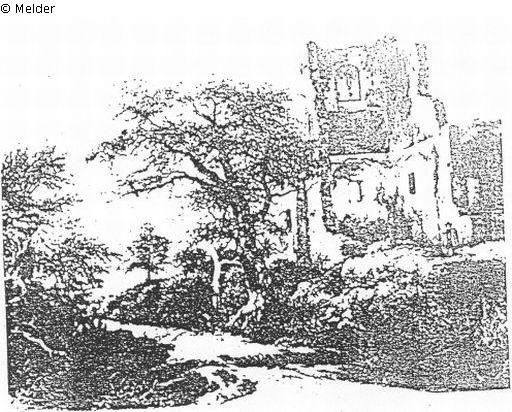 In der Mitte ein Pfad mit einer grossen Eiche, rechts von der Ruine ein Gebäude, vorne zwei Figuren