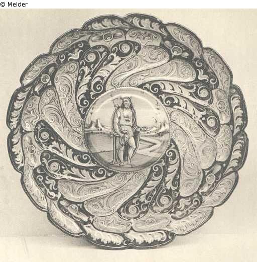 A FAENZA TAZZA WITH " SCANNELLATO " MOULDING, by Virgiliotio Calamelli da Faenza, decorated a berettino with a central medallion containing a full length figure of St. John in sheepskin and cloak holding a cross and gourd, typical green landscape with blue wavy hills, within radiating flutes decorated with formal foliate motifs in blue and white on a dark blue and brown ground, the underside with orange and blue feathery leaf scrolls on the moulded compartments, circa 1540