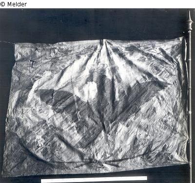 Tuch: Dünne weiße Seide. Gekrönter Adler im Mittelfeld mit Schwert und Zepter zwischen Lorbeerzweigen. Sechs Bänder zum Festbinden an der Stange. Stange mit gelbem Knopf.