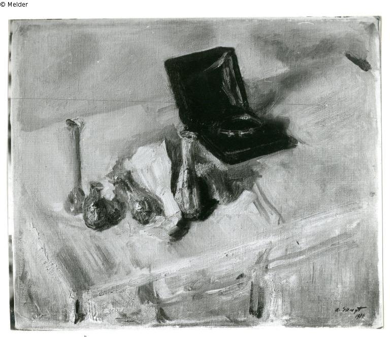 „Von außergewöhnlicher Schönheit ist dieses auf einer weißen Tischdecke präsen-tierte Stilleben mit griechischen Ausgrabungsfunden. Ein leuchtendes Geschmeide mit Glassteinen in einem mit Samt ausgeschlagenen Etui sowie mit bunten Glasflaschen sind eine Augenweide impressionistischer Malerei“. (UW)