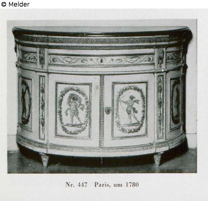 Niedrig, halbrund, Louis-XVI, mit geschnitzten Maskarons, zweitürig, mit einer Schublade und schwarzer Marmorplatte. Alte bunte Bemalung; Figuren, Ornamentik und Blumen auf grau-weißem Grund.