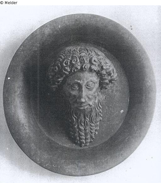 das vollbärtige Haupt des Täufers mit dickem, lockigem Haarkranz liegt auf einer Holzschüssel mit konkav gewölbtem Rand, unbemalt, Holz, Durchm. d. Schüssel 49 cm, Kalkar, auf d. Rückseite verschied. geschnitzte Zeichen