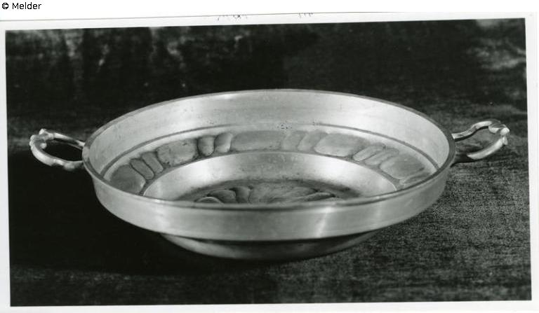 Zinn, getrieben und graviert. Runder Bogen mit Buckel und Punktrosette. Abgesetzter Rand, steile Wandung. Gebuckelter, eingeschnürter Kranz. Zwei geschwungene Henkel. Auf dem Boden Aussenseite Marke: Probezinn. 2. Marke unleserlich.