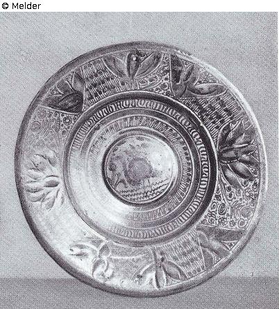 groß, mit gelblichem Kupferlüsterfond, im erhöhten Umbo ein Vogel, in den konzentrischen Kreisen Ornamente und Inschriften, auf dem Rand flach reliefierte, zum Teil blau gehöhte Blätter