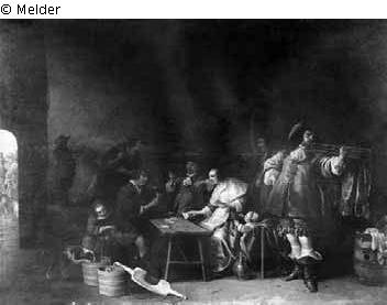 Ein Bauer spielt mit einer Frau am Tisch Karten, während ein rauchender Soldat zusieht. Er greift sich verzweifelnd an den Kopf, da ihm die Frau zwei Asse zeigt. Unterdessen zieht ihm ein kleines Mädchen den Beutel aus der Tasche, und ein Hund trinkt von der Milch, die in zwei Eimern neben ihm steht. Ein Kind zieht die Frau am Kleid. Der Hintergrund des großen Raumes ist mit Soldaten angefüllt, rechts steht ein blasender Trompeter. Vor der Tür sieht man einen Offizier und andere Soldaten.