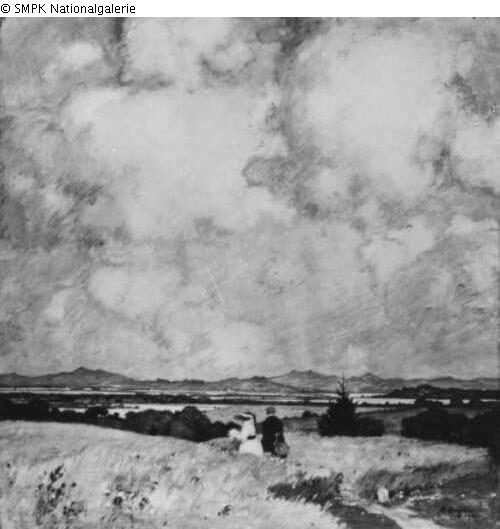 Tafelmalerei: Bild: Sommerlandschaft; Landschaft, die den Sommer bezeichnet (bei der Einteilung des Jahres in vier Jahreszeiten) & Wiese, Weideland & Fluß & hohe Wolken & laufen, wandern (als Erholung, Entspannung)