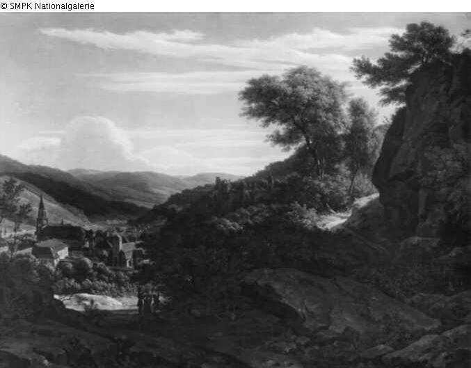 Tafelmalerei: Bild: Ruine eines Gebäudes : Burg, Schloß & Prospekt einer Stadt, Stadtpanorama, Silhouette einer Stadt & Landschaft mit einer Brücke, einem Viadukt oder Aquädukt & Laubwald