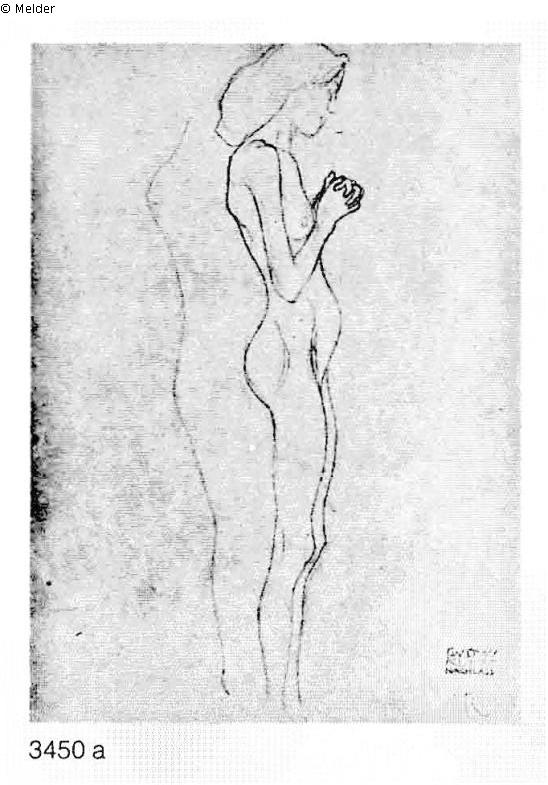 nach Werkverzeichnis Strobl, Nr. 3450a: Stehender Mädchenakt nach rechts, begleitende Linie, Bleistift. 445 : 318, Nachlaßstempel, bez. re. u.: "R"; Beethovenfries 1902 (Novotny-Dobai Nr. 127); im Zusammenhang mit dem halbwüchsigen Mädchen der "Leidenden Menschheit", die ausgeführte