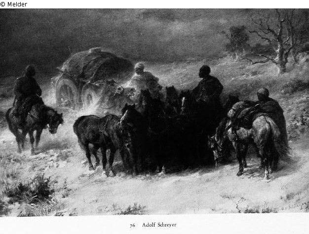 Pferde und Wagen in einer schneebedeckten Steppenlandschaft. Links und rechts Reiter. Rechts unten bezeichnet: "Ad. Schreyer."