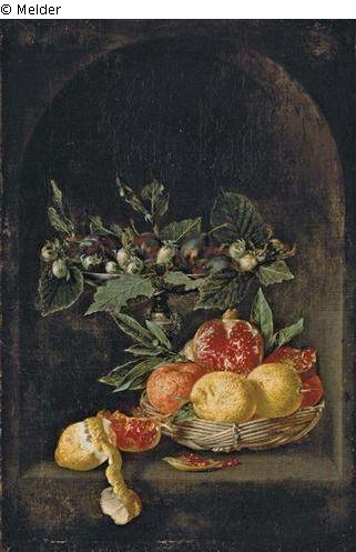 Stillleben bezeichnet. In einer Schale Haselnüsse und Pflaumen mit vielen Blättern, darunter in einem Korb Zitronen und Granatäpfel.