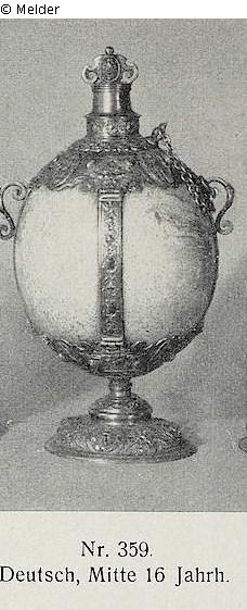 Dorotheum: 359 Straußeneiflakon in vergoldeter Bronzemontierung, auf reliefiertem mit Maskaronen und Ornamenten geschmücktem Fuß, auf dem in einer figural und ornamental reich verzierten Schale von vier Ornamentbändern mit Volutenhenkeln und einer ebenso gebildeten Schulterfassung das Straußenei montiert ist, der halsförmige Schraubverschluß mit Volutenknauf, Höhe 26 cm, deutsch, Mitte des 16. Jahrh. (siehe Abbildung Tafel 42)