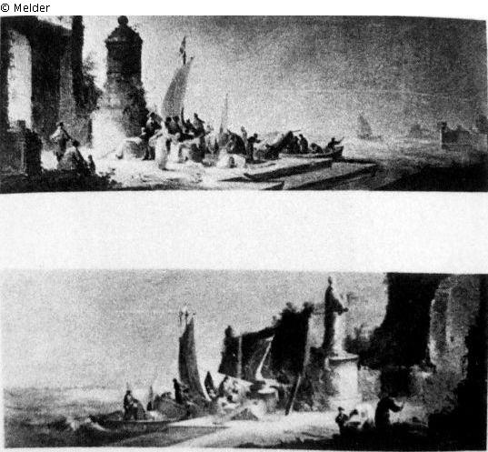 Romantische Küstenlandschaft mit sehr reicher farbiger Kauffahrtei-Staffage