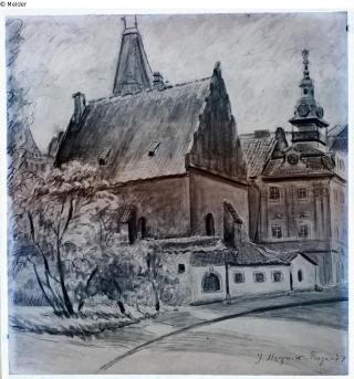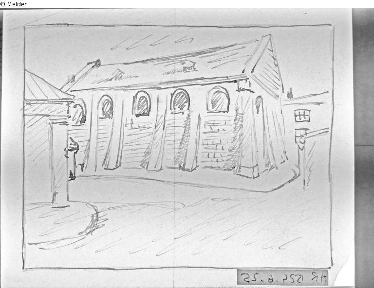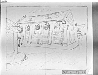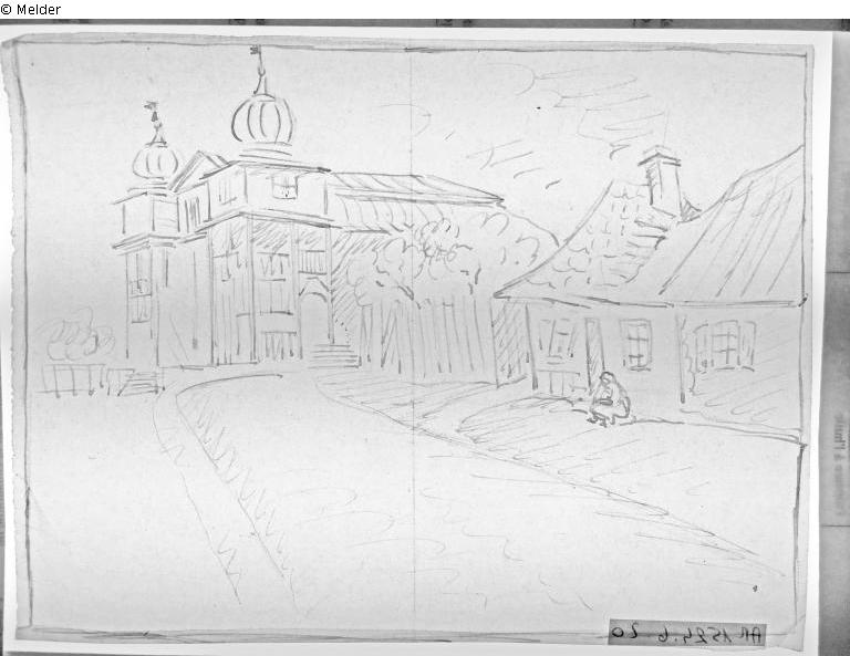 Folio- oder Loseblatt- ähnliche Sammlung von Zeichnungen/Gemälden von Synagogen; das Folio enthält einzelne Gemälde, die in einer Kombination aus Zeichnung und Malerei mit Aquarellfarben, Gouache und vielleicht Pastell(en) entstanden sind; auf den ersten Blick scheint das Folio ein Buch zu sein; im Inneren findet man jedoch die einzelnen, losen, ungebundenen Zeichnungen/Gemälde