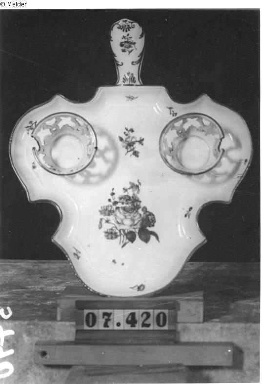 Anbietplatte mit zwei Deckeltassen. Die Platte in Form eines symmetrisch stilisierten Weinblattes mit aufgebogenem Rand, der hochgebogene Stiel als Griff gebildet. In den beiden seitlichen Ausbuchtungen zwei aus Gitterwerk bestehende Einsatzkörbe. Auf der Platte polychrom gemalter Straße "Natürlicher" Blumen und Streublumen auf Wandung und Deckel mit Knospenknauf. Randkanten und Standringe vergoldet, Henkel teilvergoldet. Einsatzkörbe ergänzt und restauriert.