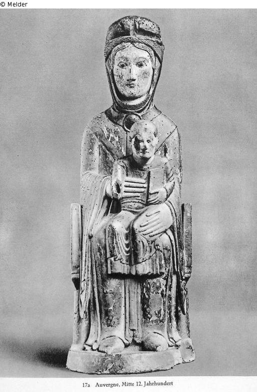 Auf einem architektonisch gegliederten Sessel sitzt Maria und hält mit beiden Händen das bekleidetet Christuskind, das in der Linken ein Buch hält. Beide frontal aufgerichtet. Vollrund, mit alter Fassung. Rechte Hand des Kindes fehlt;