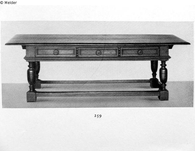 Gestreckt rechteckig, Nußholz hell gebeizt. Vier gedrechselte Balusterbeine, verbunden durch Fußstege, in der Zarge mit Profilstäben Schubladen.