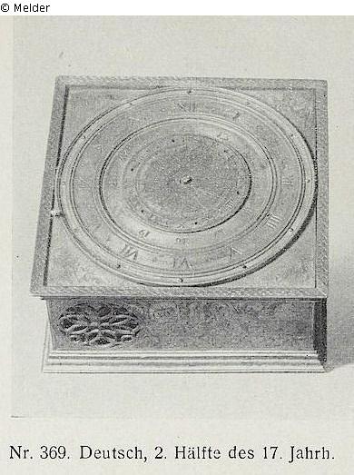 Dorotheum: 369 Tischuhr, Bronze, vergoldet, in quadratischem Gehäuse, mit zweifachem Zifferblatt, das Gehäuse am Deckel und den vier Seitenwänden mit gravierten, mythologischen und allegorischen Darstellungen verziert, an zwei Seiten ausgesägte Rosettenfenster, die das Werk freilegen, an der gleichfalls gravierten Unterseite freiliegend Hebel und Räder des mit Schlagwerk versehenen Uhrwerkes. Datiert 1675, 7,5 x 14,5 x 14,5, deutsch, 2. Hälfte des 17. Jahrh. (siehe Abbildung Taf. 46)