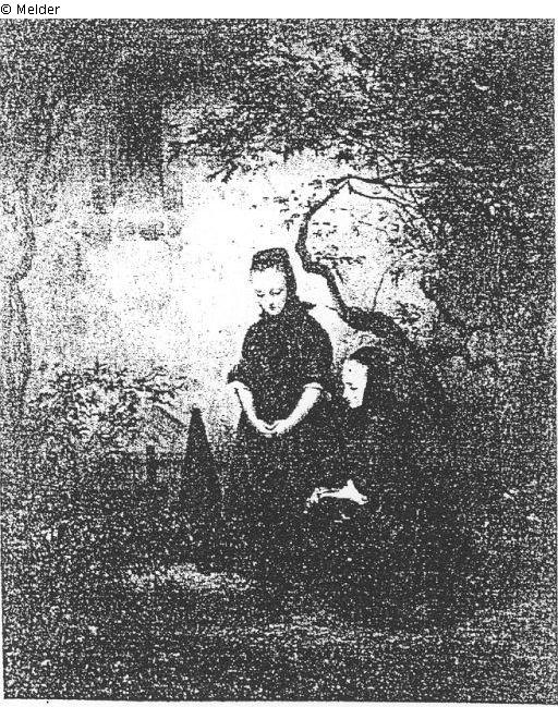 zwei kleine Mädchen in hessischer Volkstracht am Grabe der Eltern, im Hintergrund die Mauer der Dorfkirche; signiert und datiert: 1849