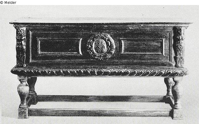 Mit späterem Untersatz, Nussbaum, reich geschnitzt, in der Mitte Wappen, Renaissance