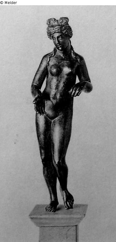 Venus, stehend, die Rechte vorgestreckt, in der Linken einen Apfel, Bronze, Marmorsockel, dunkle grünliche Lackpatina