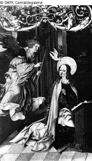Tafelmalerei: Altarflügel: die Verkündigung: Maria sitzt; sitzen
