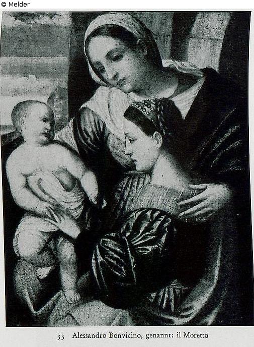 Die jugendlich reich gekleidete Heilige steht, Profil nach links, in grauem buschigem Seidenkleid vor der hinter ihr vor einem Gemäuer sitzenden Madonna, die ein purpurrotes Kleid, weißes Kopf- und Brusttuch, blauen und olivfarbenen Umhang trägt und ihre Linke um die Schulter der Heiligen, ihre Rechte um das nackte auf ihrem rechten Knie sitzende Jesuskind legt. Dieses reicht der Heiligen die Märtyrerpalme und wird von ihr mit ehrfurchtscheuer Hand geliebkost. Hinter der Madonna öffnet sich eine grüne Berglandschaft. Anitker Holzgeschnitzter Goldrahmen.