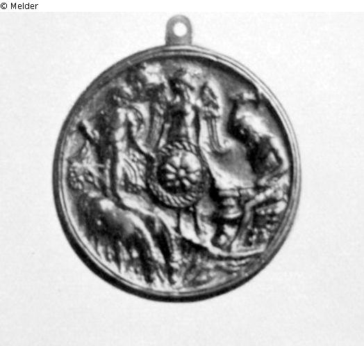 Bronzemedaille, rechts der nackte Vulkan beim Schmieden, in der Mitte geflügelte Siegesgöttin mit Rundschild, links nackter Jünglich und zwei grasende Pferde