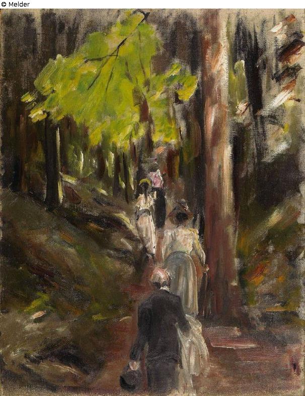 Die vorliegende Abbildung wurde erst nach Drucklegung des ersten Bandes bekannt. Die Vorlage dazu stammt aus der Korrespondenz, die im Jahre 1909 zwischen Eduard Fuchs, dem das Bild gehörte, und Gustav Pauli geführt wurde, der Material für seine Monographie über Liebermann zusammentrug. [Archiv der Hamburger Kunsthalle] Pauli hatte offenbar daran gedacht, das Gemälde in sein Buch aufzunehmen, auch schon einen Andruck fertigen lassen, muß dann aber Abstand von seinem Vorhaben genommen haben. Nach Angaben von Eduard Fuchs zeigt das Bild die Familie Liebermann bei einem Waldspaziergang.