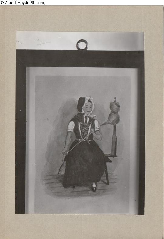 In einfachem Holzrahmen: Junge Frau in ländlicher Tracht mit Handspindel am Wocken sitzend. Gezeigt im ländlichen Raum im 3. Obergeschoss der ehem. Gubener Stadtmuseums (vgl. Inv. Nr. 1788).