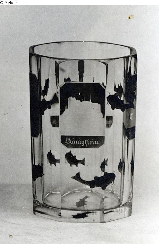 8-kantig, 3 Ansichten geschnitten: "Bastey", "Otto. Gr.", "Königsstein", 4. Feld: "Clara". Mit Rot- und Violettätze. Darunter und dazwischen Fischchen in gold-brauner Transparentmalerei.