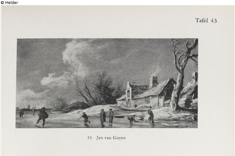 Auf einem zugefrorenen Fluß, der sich in die Ferne erstreckt. Schlittschuhläufer und zwei Fischer, die das Eis aufhacken. Rechts Hütten unter Bäumen, in der Ferne eine Kirche. Bezeichnet rechts unten mit Monogramm J.v.G. Goldener Rahmen. Veröffentlicht von Hofstede de Groot, van Goyen-Katalog Nr. 1207. Gutachten: Hofstede de Groot. Juni 1927.