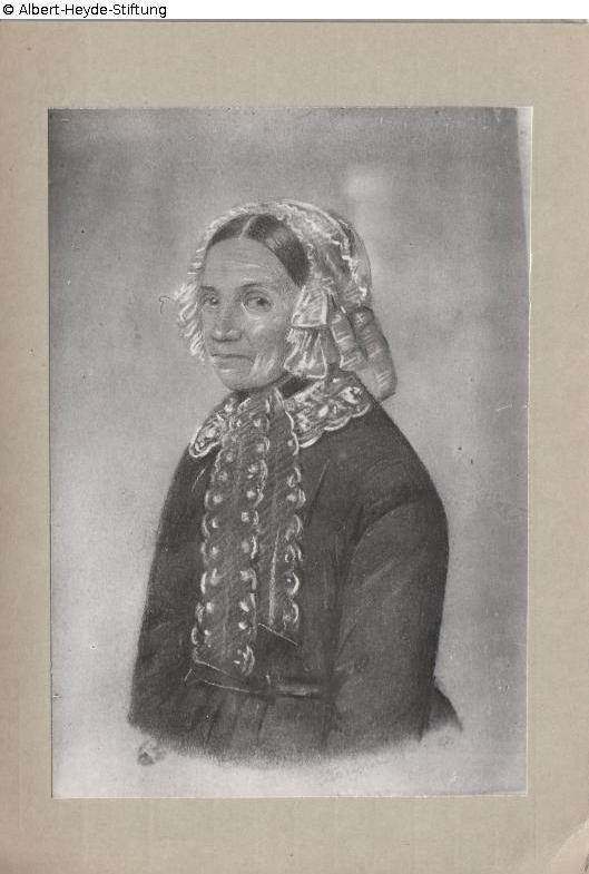 Von halblinks dargestellte Halbfigur einer älteren Frau in dunklem Gewand mit Tüllhaube und Spitzenkragen. Signatur unten rechts nicht eindeutig lesbar: "Kreyher d. 4.4.57", vielleicht Otto Kreyher (1836-1905).