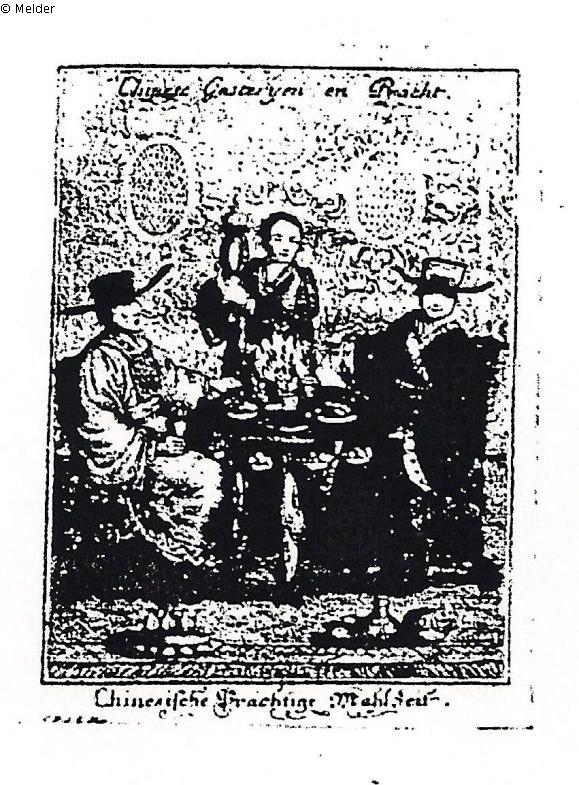 ohne Marke, Chinesen, nach Stich von Engelbrecht herausgegeben; Salomon, November 1912, Katalognummer 95: "Dose mit gewölbten Deckel, oval, in der Mitte ausgebaucht. Die Dose bunt bemalt mit sitzenden Chinesenfiguren; darunter Goldspitzenborte. Auf dem De
