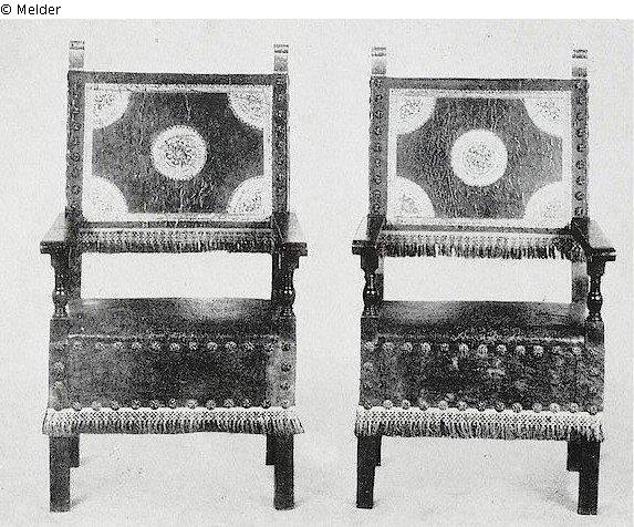 Vorderbeine gedreht, rückwärts Stollenbeine, das vordere Verbindungsstück geschnitzt, als Armstütze Baluster, die Armlehnen leicht geschwungen , die Rückenlehne gerade, auf dem Pfosten über der Lehne stehende Akanthusvoluten, Sitz und Lehne mit altem Leder bezogen, Beschlag von Messingnägeln.