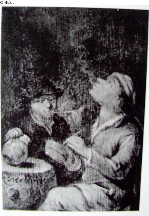 Zwei Raucher vor einer Biertonne sitzend, der Mann im Vordergrund rechts bläst gerade den Dampf in die Luft. Signiert unten links: K.Molenaer, Rücks. Siegel der Slg. Wassermann und Zettel aus Verst.Katalog Déglise (Paris, Drout, 26.3.1902, Nr. 81)