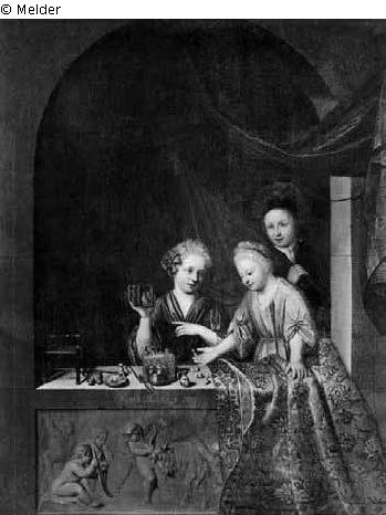 Laut Hofstede de Groot am 20. April 1816 bei Dr. Luchtmans in Rotterdam (Lot. Nr. 98) zusammen mit dem Gegenstück [Ahv 248] für 300 Gulden an v. d. Bergh verkauft. Laut Aldenhoven zusammen mit Nr. 248 im Jahr 1818 für 2000 Taler gekauft; Herkunftshinweis 1826: Herzog August. 1943 noch im Museum vorhanden (Katalog 1943, Bl. 173); heutiger Standort: Puschkin-Museum Moskau, Objekt: 1010175, Nummer: ЭЖ-959 (40,8 x 32,8 cm).