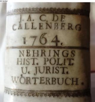 J. A. C. DE CALLENBERG (Johann Alexander Reichsgraf von Callenberg 12.3.1697 - 13.2.1776)goldene Schrift auf weißem oder ursprünglich gelbem (vergilbt) Hintergrund, drei Zeilen mit Jahreszahl und unter dem Trennstrich der Buchtitel