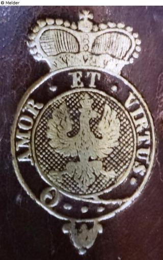 Kreisförmiges Wappen mit Fürstenkrone, im Wappen Adler und umlaufendes Spruchband mit dem Spruch „AMOR ET VIRTUS“Gold, auf verschiedenen Vorlagen