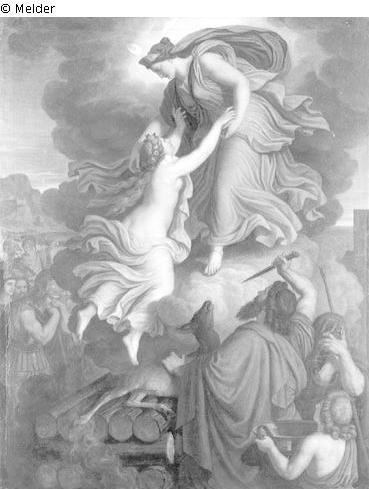 Found-Object Report | Object report Artemis freeing Iphigenia, who was to be sacrifice Lost Art-ID220775 Previous Next Artist / Creator Rahl, Carl Birth 1812.08.13, Wien Death 1865.07.09, Wien Place of activityRom; Wien TitleArtemis freeing Iphigenia, who was to be sacrifice Dating1861Object typePaintingGroup of reported objectsPaintingMaterial / TechniqueOil / painted Height 174.50 cm Width 137.50 cm Inventory numbermü9103/2Description Signature: C. Rahl, painted 1861; Below the sacrificial altar, above Iphigenia is received by Artemis (standing on clouds). On the left warriors. (On reverse old note: see signature). Read more Read less Holding Kulturgüter aus dem ehemaligen ReichsvermögenProvenance Sold by Count Wimpf's forestry office to the Reich Chancellery in 1940. Read more Read less Published since2001 Contact Kunstverwaltung des Bundes Herbert-Bayer-Straße 5 13086 Berlin Germany E-Mailprovenienzforschung@kvdb.bund.deHomepagehttp://www.kunstverwaltung.bund.de