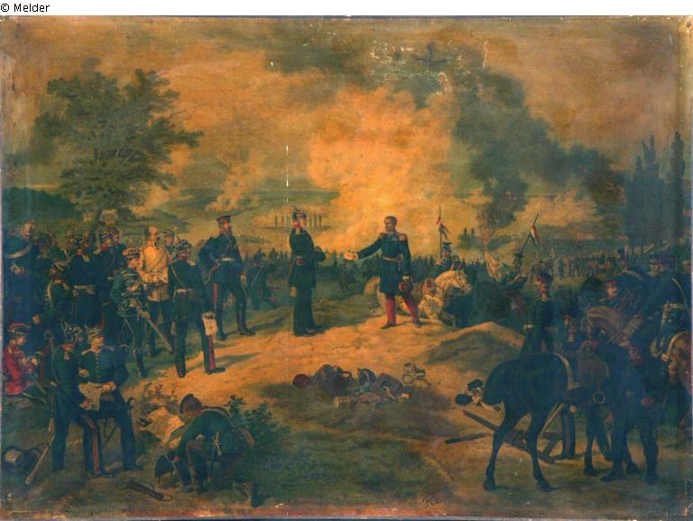 Battle of Sedan 1870. King Wilhelm of Prussia receives the French negotiator and envoy of Napoleon, General Count Reille. Napoleon's negotiator and envoy, General Count Reille; lower centre right (brown oil paint): Fkaiser