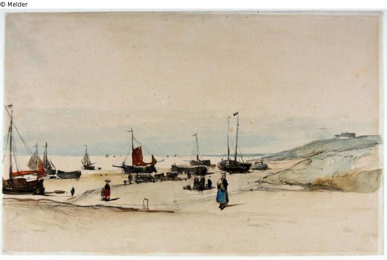 Several sailing boats ashore and on the water; in the foreground in the dunes a female figure with a blue apron
