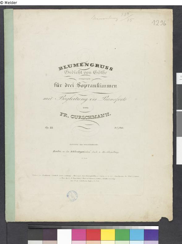 Blumengruß, Gedicht von Goethe, componirt für drei Sopranstimmen mit Begleitung des Pianoforte von Fr. Curschmann, op. 22.
